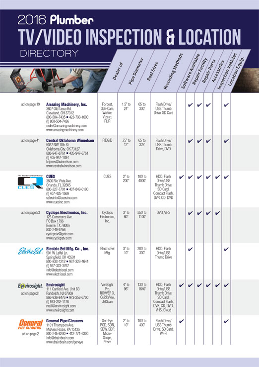 Home Editorial 2016 TV/Video Inspection Directory Mar 23, 2016 | TAGS (1) Directory View the 2016 Plumber Magazine TV/Video Inspection Directory »