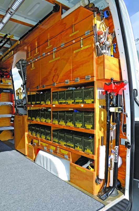 Each storage unit reflects Lai’s firm belief that well-organized service vehicles, able to carry as many tools and repair parts as possible, are the key to improving productivity and profitability. And there’s no doubt his units accomplish that goal. Built by a plumber for plumbers, the vans he creates can carry almost every tool and spare part imaginable. In fact, Lai believes anyone who examines the storage units — which take him between 185 and 220 hours to build and cost about $2,500 for materials — would be hard-pressed to find any wasted space, thanks to their cleverly configured and clearly labeled bins, slots, cubbies and cabinets.