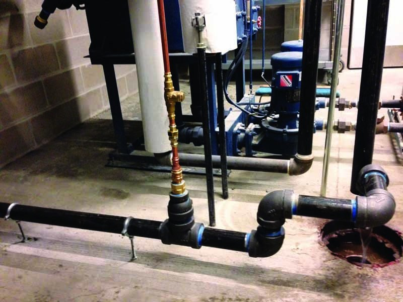 Solution: Guttmann & Blaevoet Consulting Engineers designed the project, with Tünde Munz, P.E., LEED AP and Principal of G&B, initiating the solution. As required by code, these low-pressure boilers must have relief valves. Due to safety concerns about venting steam near where students are congregating, the designer chose to vent the relief valves into suitably sized piping, which runs to a floor drain inside the boiler room. To comply with plumbing codes limiting maximum drain discharge temperatures, the designer chose to add self-operating, thermostatic, drain-tempering valves that only inject cold water into the vent lines when the relief valves activate. These drain-tempering valves from ThermOmegaTech automatically detect when the drain temperature is above allowable levels and discharge just enough water to temper drain flow below the allowable 140 degrees F.