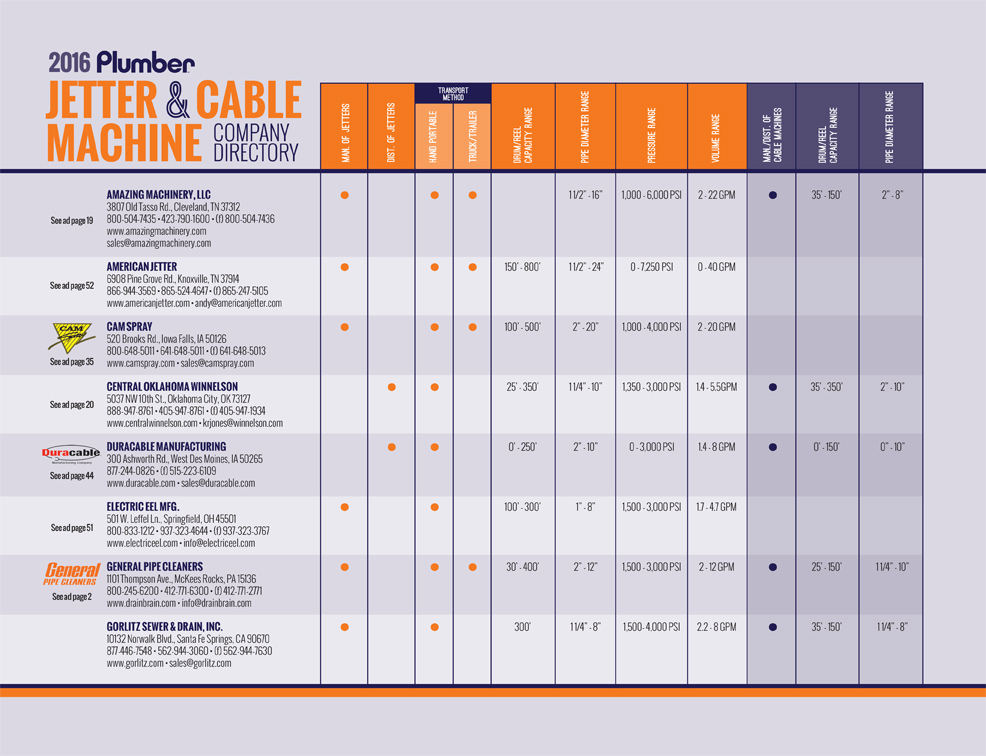 Home Editorial 2016 Jetter & Cable Machine Directory Sep 26, 2016 | TAGS (1) Directory View the 2016 Plumber Jetter & Cable Machine Company Directory »