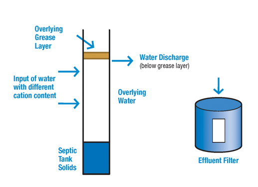 3. Chemical and biological upsets such as no scum layer or a scum layer that looks like and has the consistency of milkshakes with no stratification in the septic tank. Scientists in the group confirmed that salts can emulsify grease, keeping it suspended in the tank and, therefore, able to reach the drainfield in the effluent.