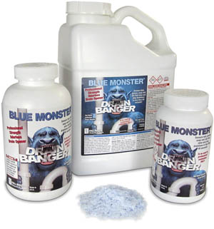 Blue Monster Drain Banger professional-strength drain opener from Clean-Fit Products, a division of The Mill-Rose Co., devours hair, grease, soap and organic matter in less than 60 seconds. Available in three sizes the hot-water activated cleaner is odorless and will not harm plumbing fixtures, porcelain or septic systems. It also can be used for preventative maintenance to eliminate hair, grease, soap and oil buildup. The blue-flake drain cleaner is available in 1-, 2- and 6-pound easy-pour containers. 800/321-3598; www.cleanfit.com.