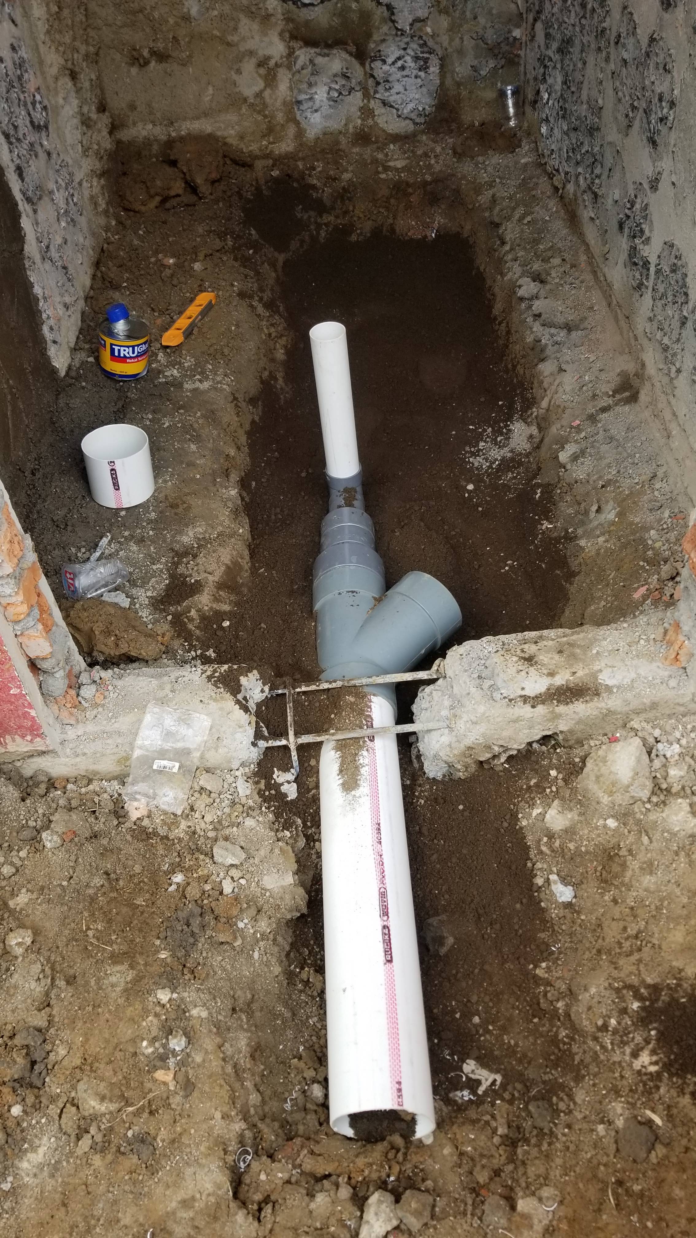 My team was in charge of the underground piping for the bathrooms and the piping to the septic tank, as well as concrete mixing for the floors. For the piping material we used PVC. Imagine SDR 35 weight PVC but thinner. Not the greatest quality but it’s what we had to work with. The joints were glued and the fittings were of much better quality than the pipe. The soil is clay and it makes for a long day digging excavations by hand. The work was being done inside the four bathrooms — 3.5 by 6.5 feet — where the floors have been completely removed. It was very tight quarters to work in while trying to swing a pick axe or use a shovel.